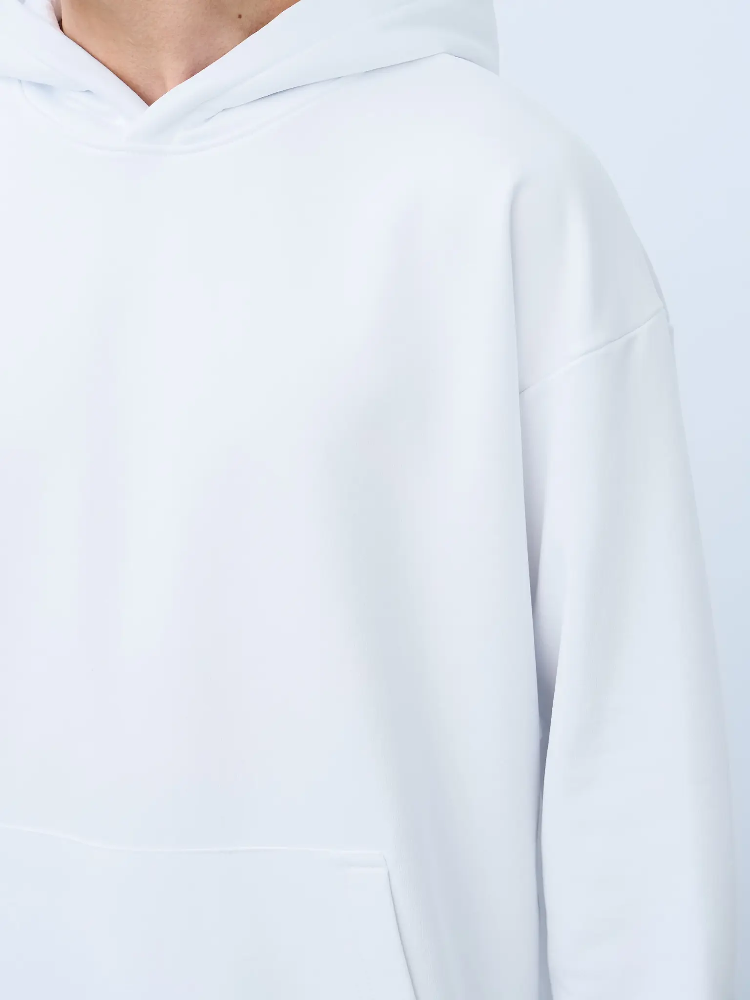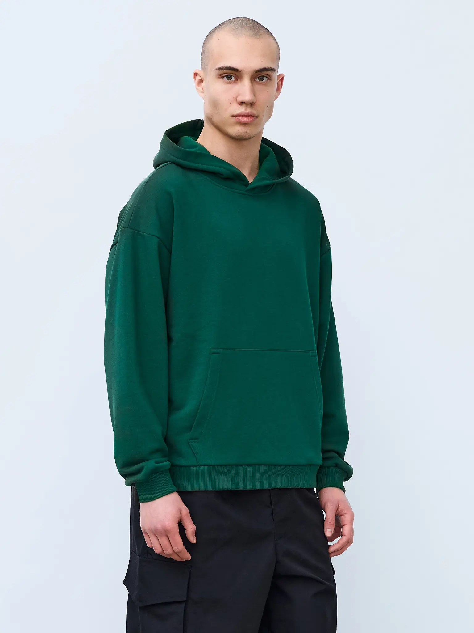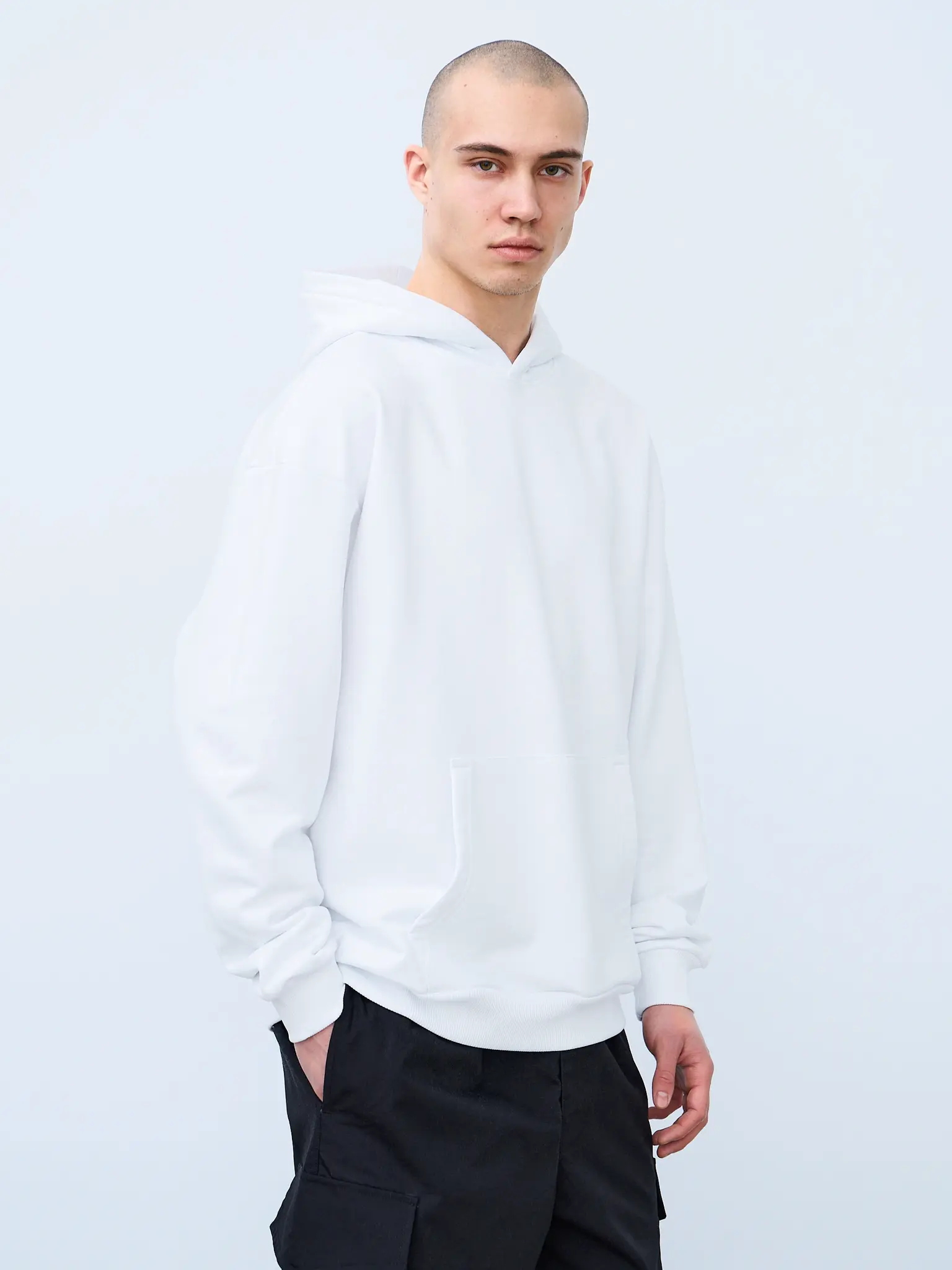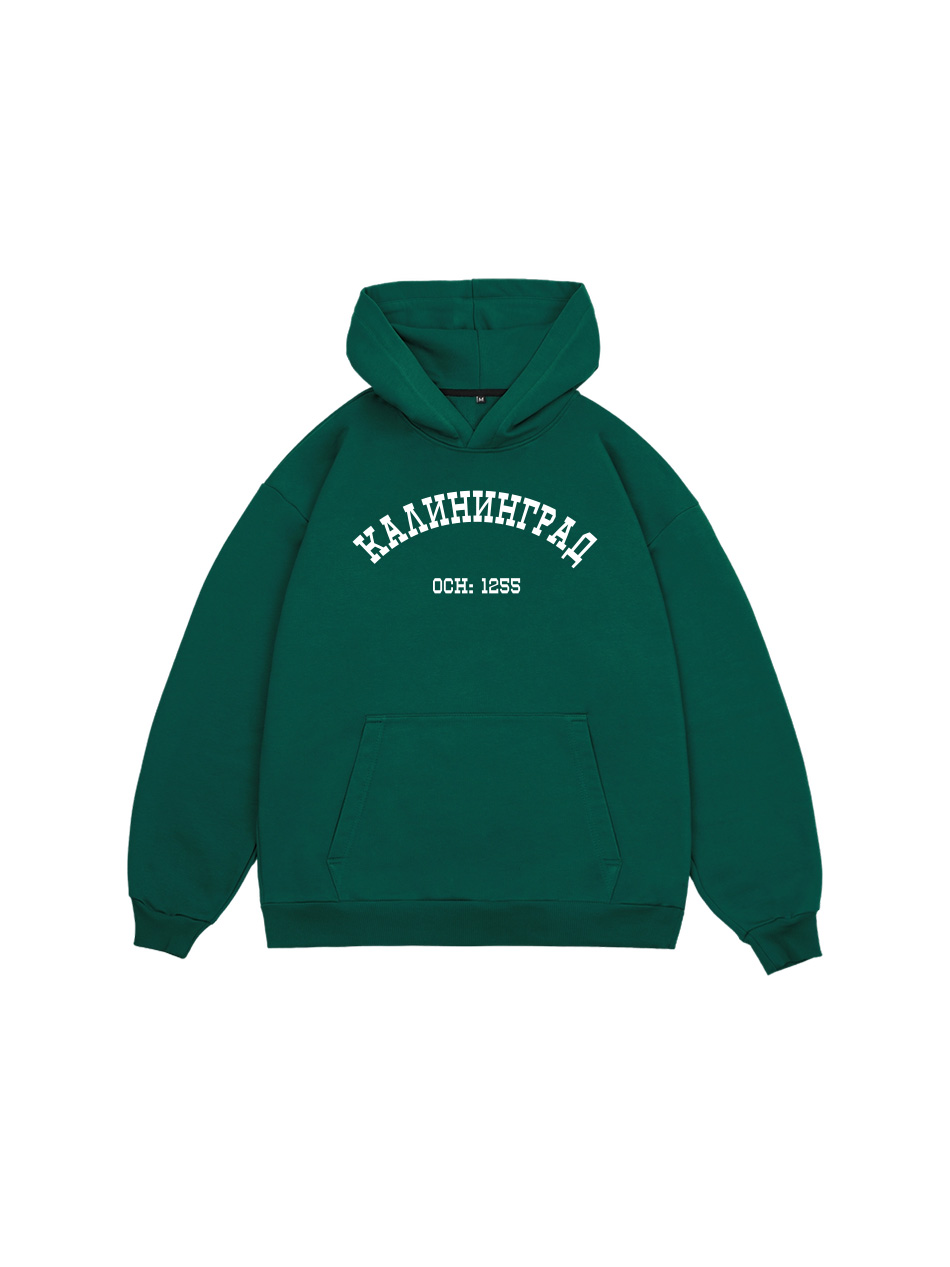 Худи оверсайз кроя, выполненное из трикотажного полотна "футер" с начесом на изнаночной стороне. Свободный силуэт, средняя длина и спущенная линия плеча. Манжеты и пояс выполнены из ребристого эластичного полотна "кашкорсе". Во внутренней стороне горловина по спинке усилена хлопковой киперной лентой, по центру вшит тканевый жаккардовый размерник черного цвета, на внутреннем боковом шве имеется нейлоновый составник. Худи оснащено накладным карманом. В капюшоне отсутствует шнурок. Толстовки не имеют брендированных обозначений и индивидуально упакованы в ПВД пакет.