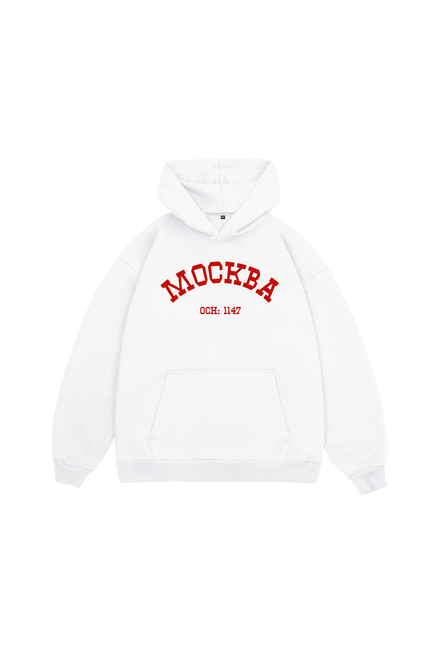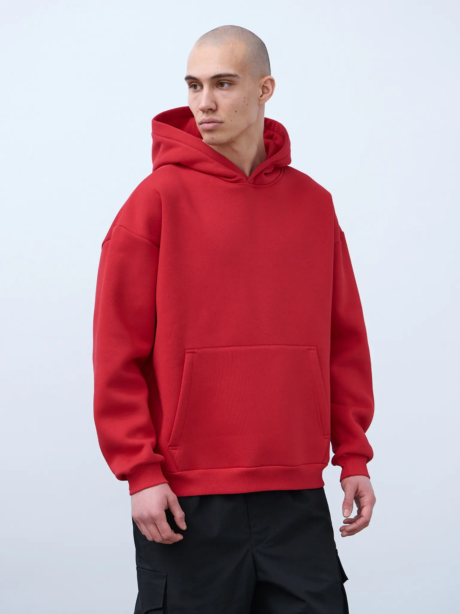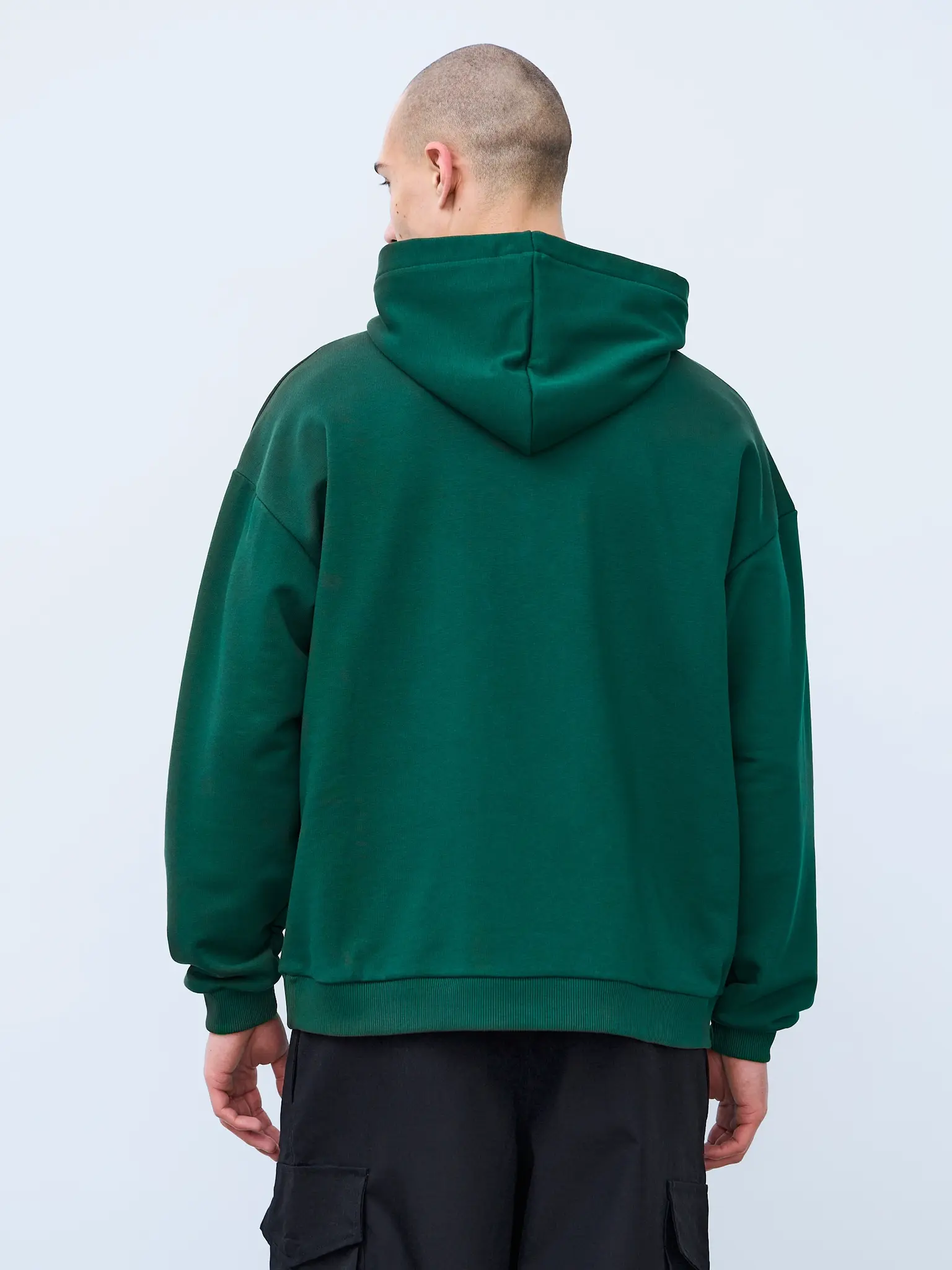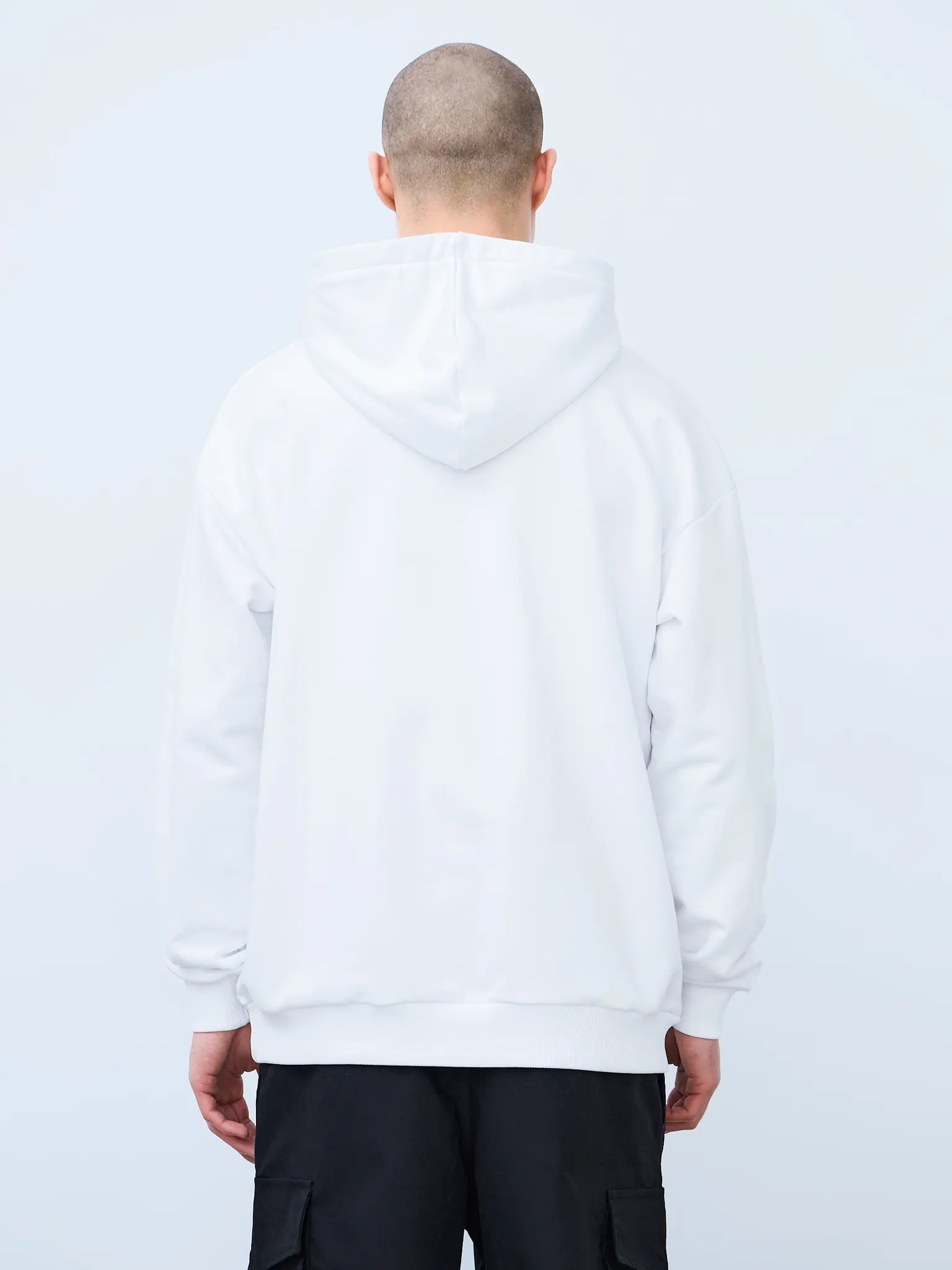 Худи оверсайз кроя, выполненное из трикотажного полотна "футер" с начесом на изнаночной стороне. Свободный силуэт, средняя длина и спущенная линия плеча. Манжеты и пояс выполнены из ребристого эластичного полотна "кашкорсе". Во внутренней стороне горловина по спинке усилена хлопковой киперной лентой, по центру вшит тканевый жаккардовый размерник черного цвета, на внутреннем боковом шве имеется нейлоновый составник. Худи оснащено накладным карманом. В капюшоне отсутствует шнурок. Толстовки не имеют брендированных обозначений и индивидуально упакованы в ПВД пакет.