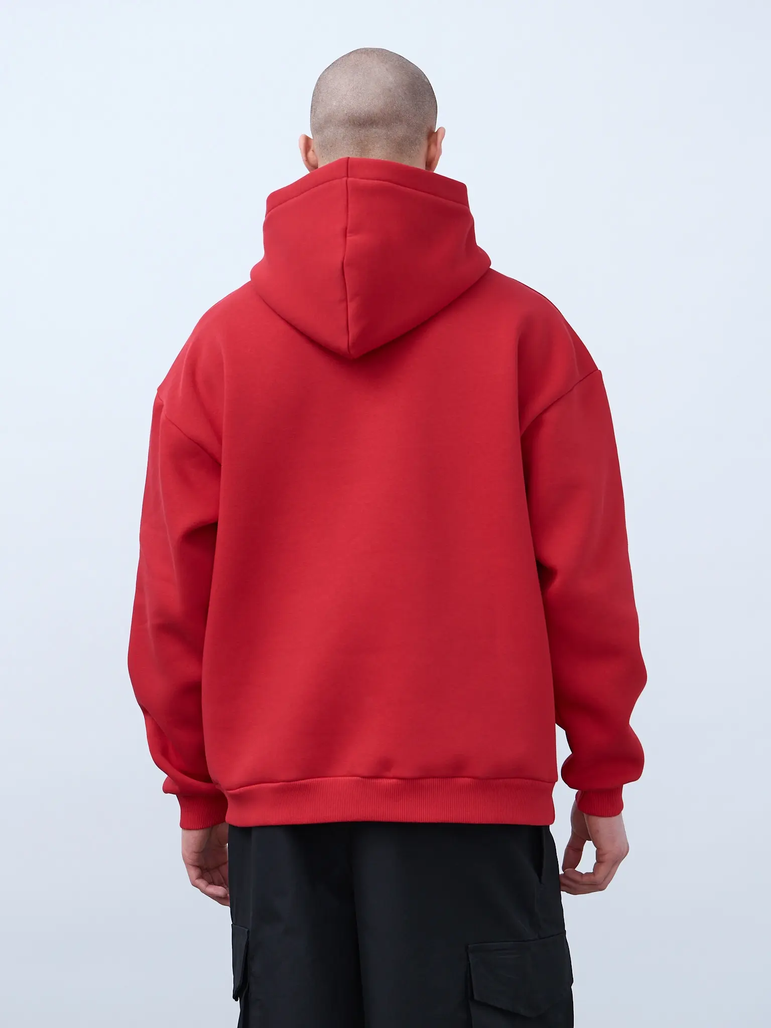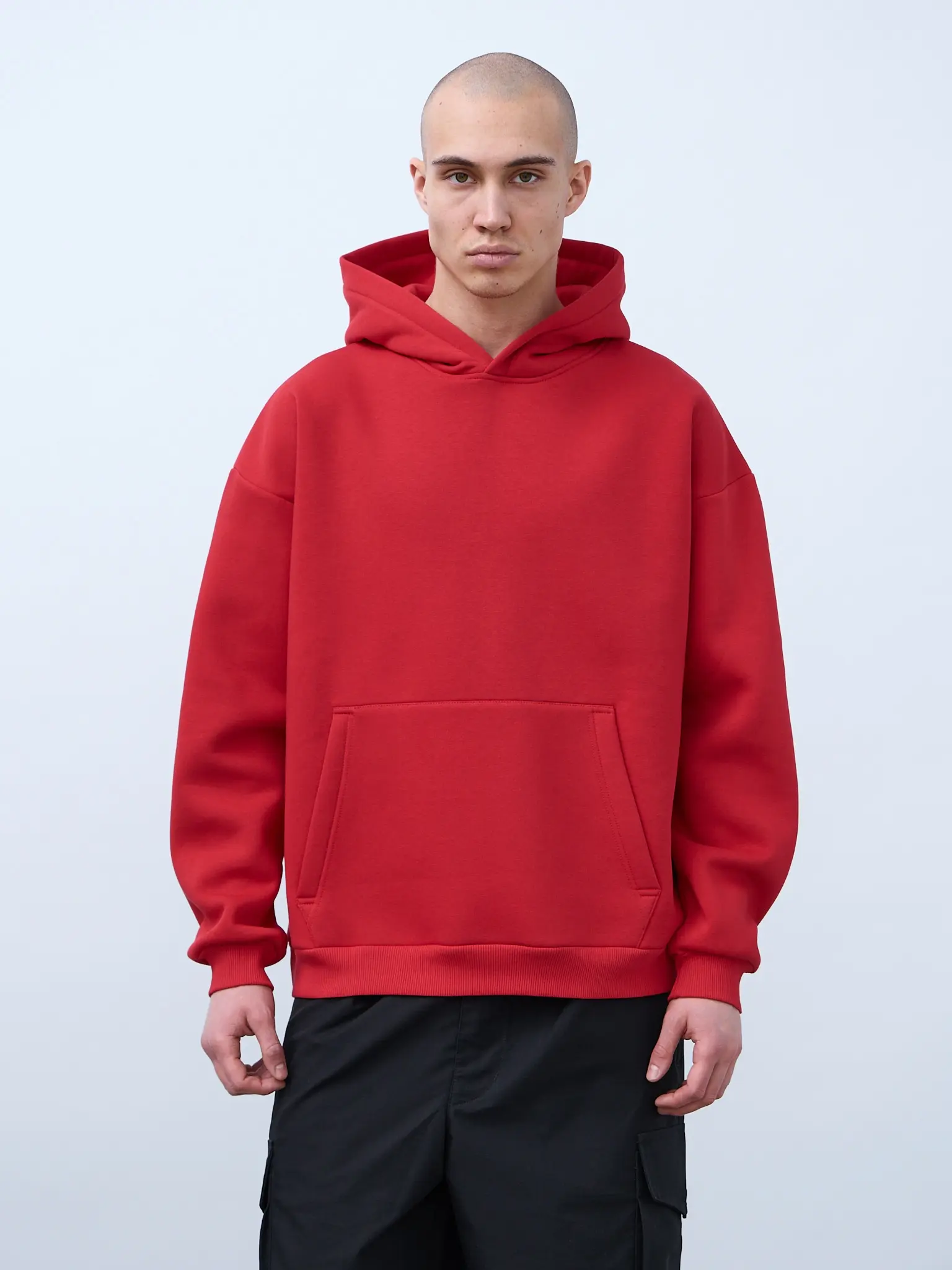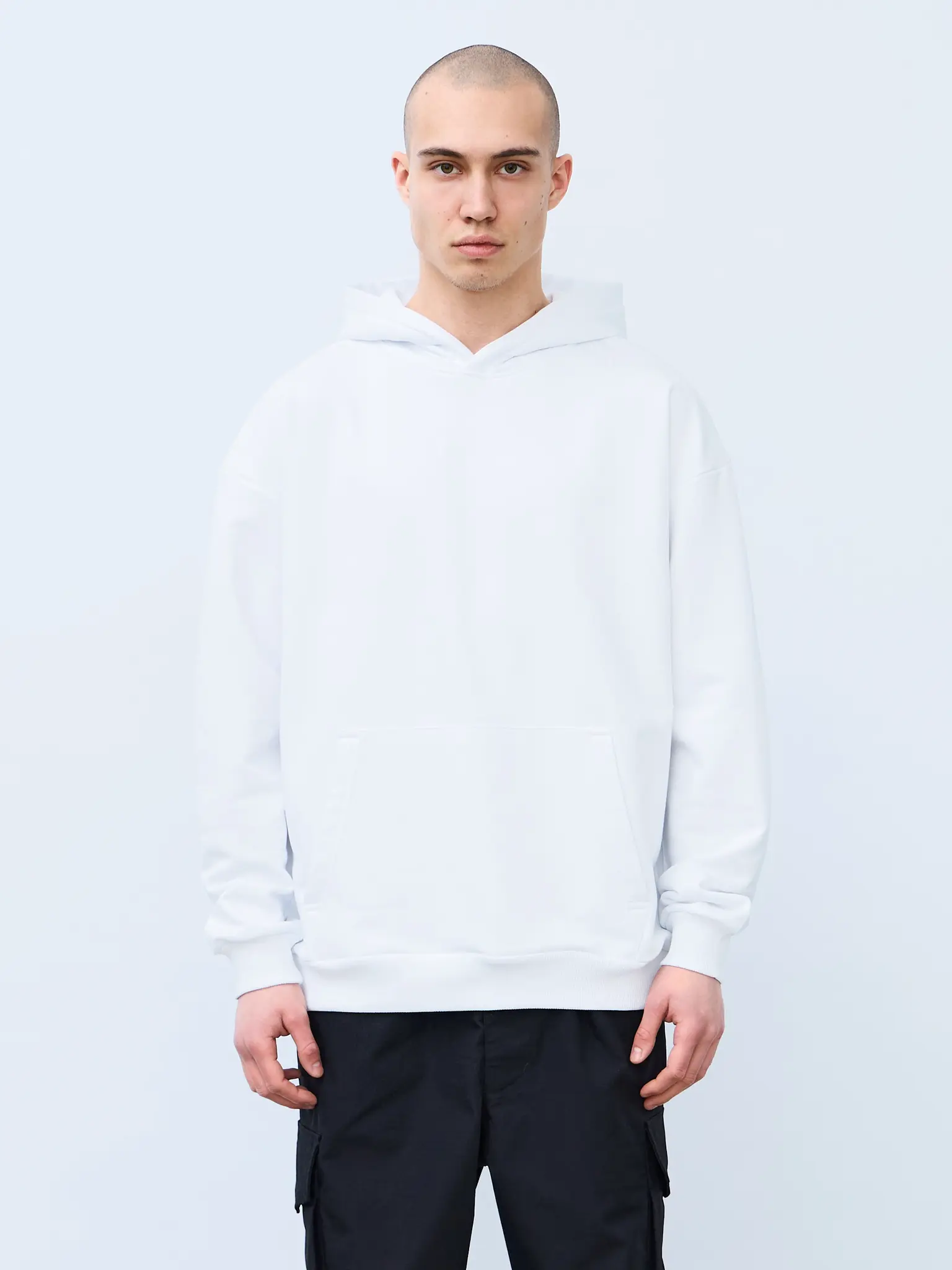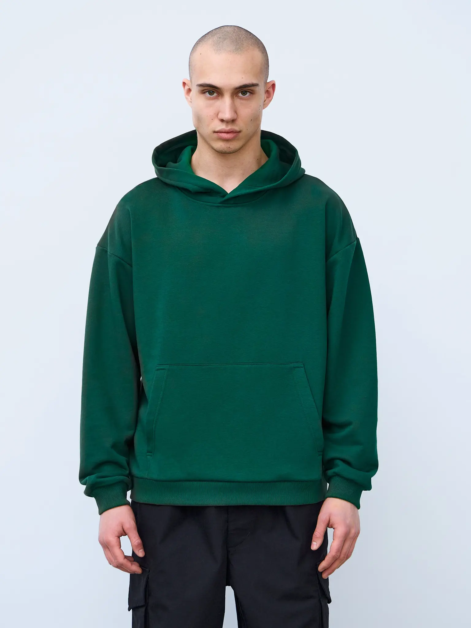 Худи оверсайз кроя, выполненное из трикотажного полотна "футер" с начесом на изнаночной стороне. Свободный силуэт, средняя длина и спущенная линия плеча. Манжеты и пояс выполнены из ребристого эластичного полотна "кашкорсе". Во внутренней стороне горловина по спинке усилена хлопковой киперной лентой, по центру вшит тканевый жаккардовый размерник черного цвета, на внутреннем боковом шве имеется нейлоновый составник. Худи оснащено накладным карманом. В капюшоне отсутствует шнурок. Толстовки не имеют брендированных обозначений и индивидуально упакованы в ПВД пакет.
