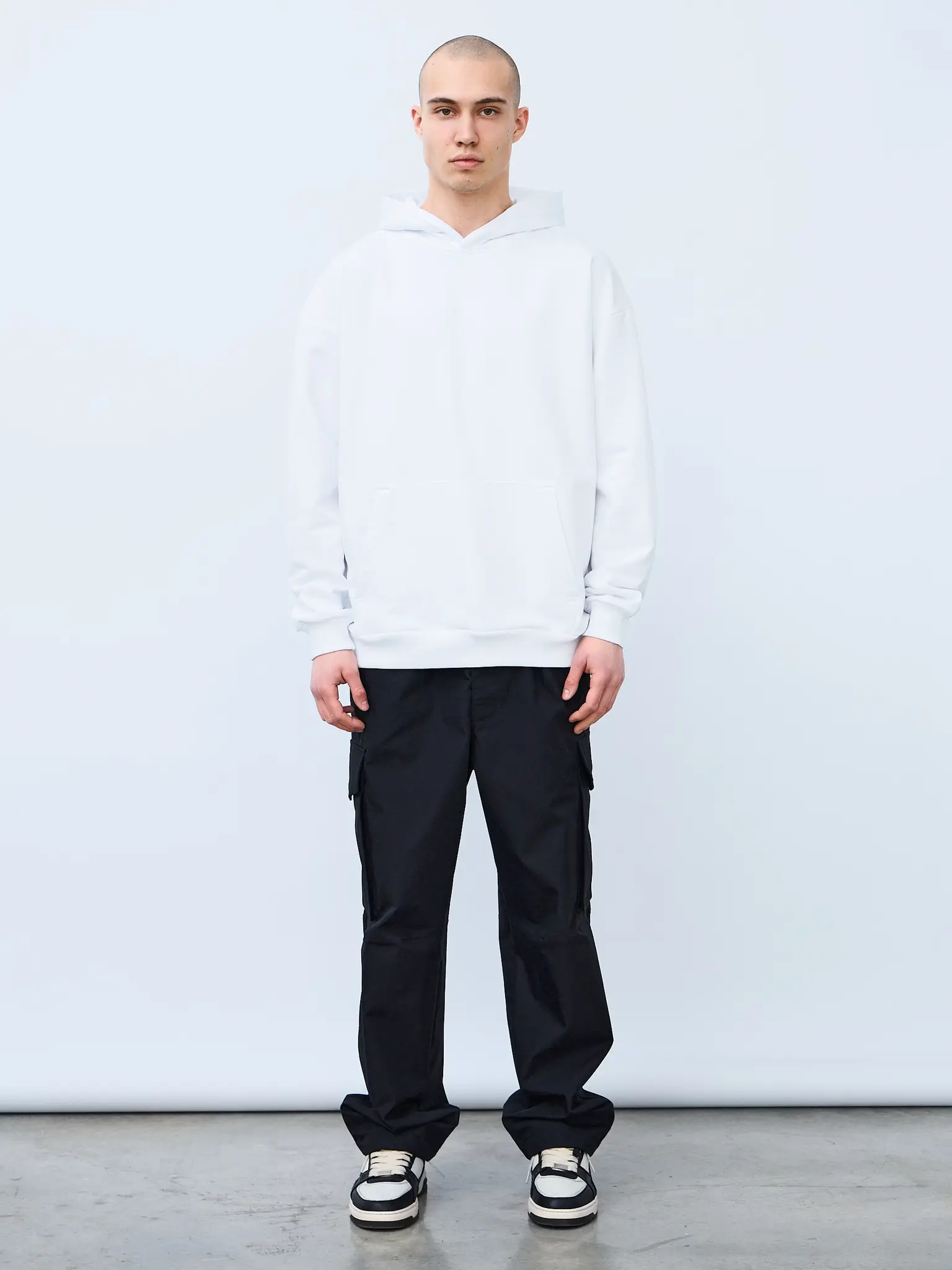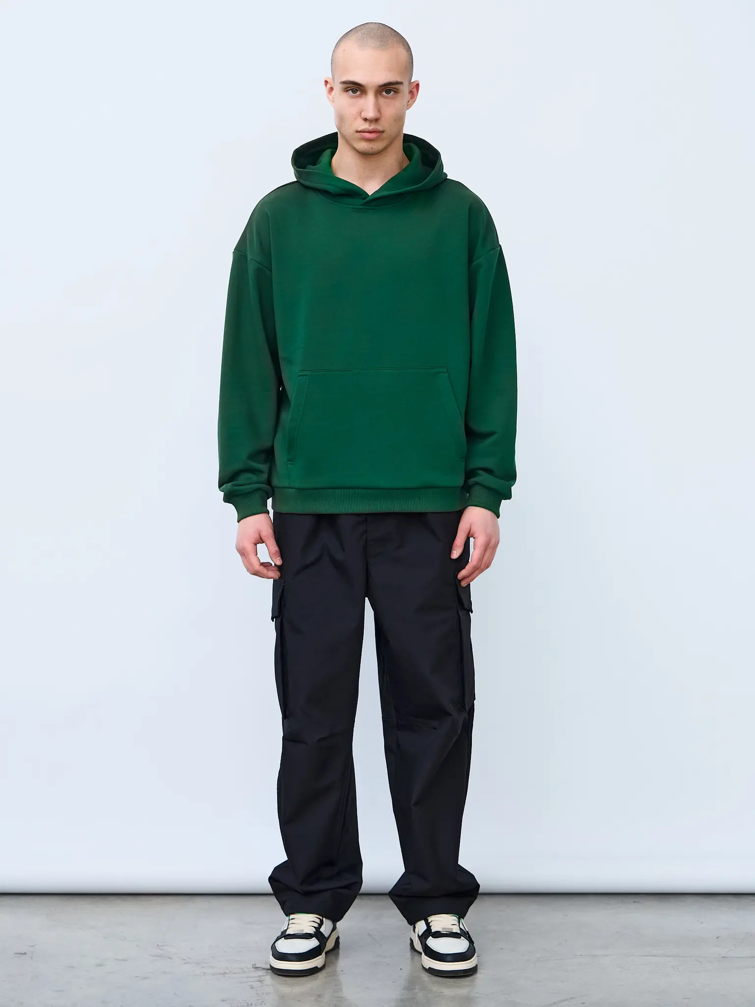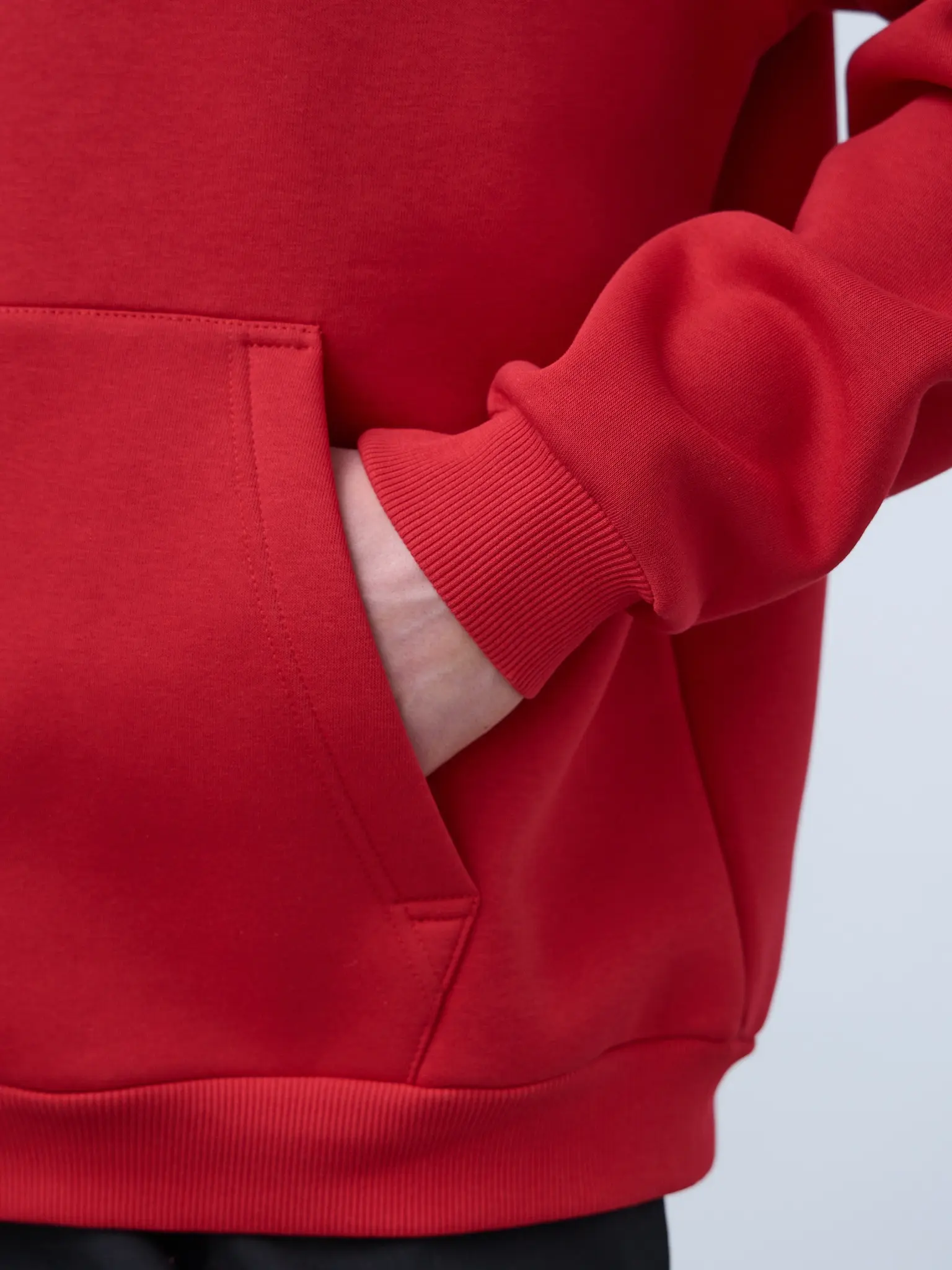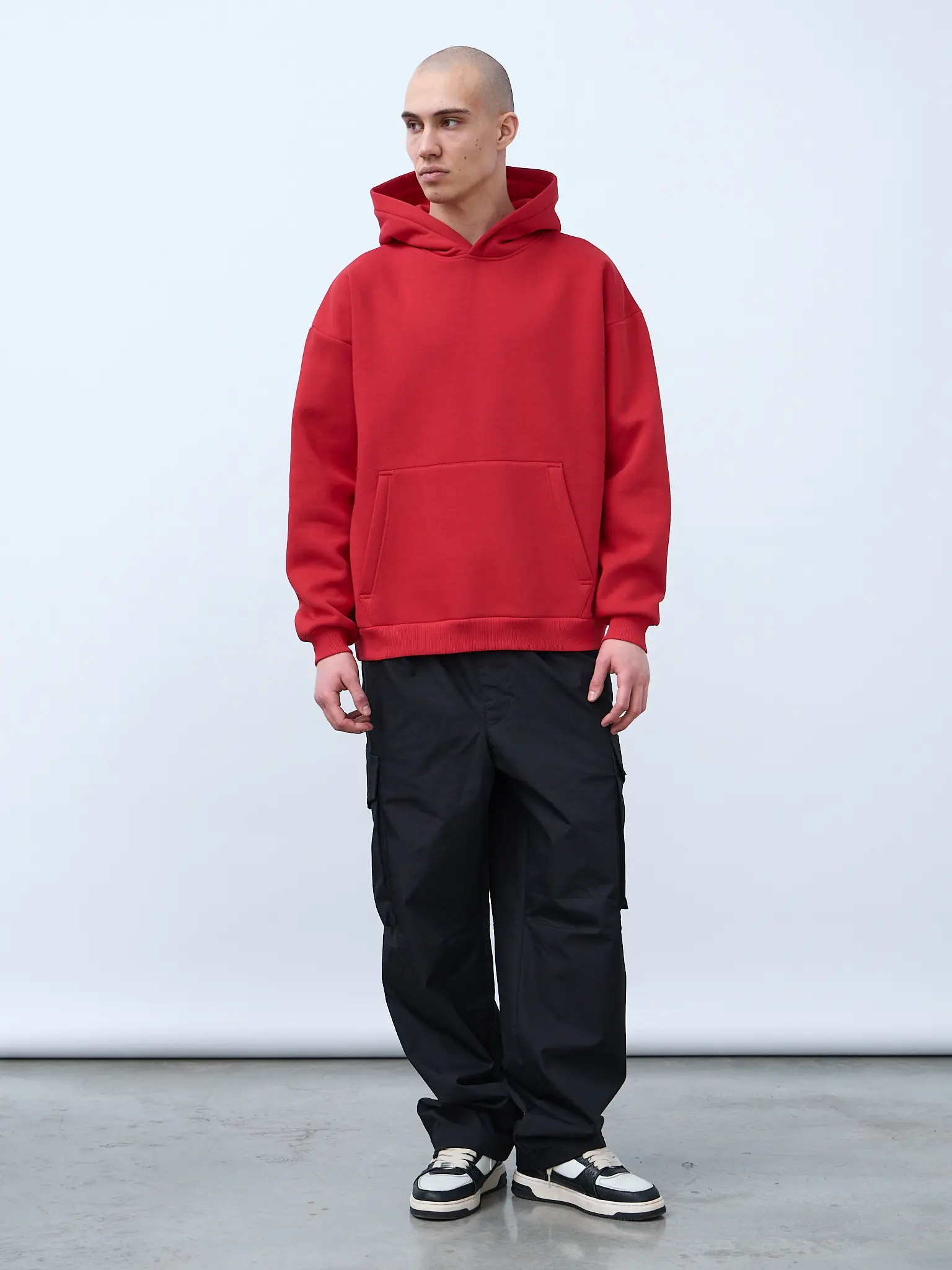 Худи оверсайз кроя, выполненное из трикотажного полотна "футер" с начесом на изнаночной стороне. Свободный силуэт, средняя длина и спущенная линия плеча. Манжеты и пояс выполнены из ребристого эластичного полотна "кашкорсе". Во внутренней стороне горловина по спинке усилена хлопковой киперной лентой, по центру вшит тканевый жаккардовый размерник черного цвета, на внутреннем боковом шве имеется нейлоновый составник. Худи оснащено накладным карманом. В капюшоне отсутствует шнурок. Толстовки не имеют брендированных обозначений и индивидуально упакованы в ПВД пакет.